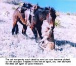 As the lion approached the dogs, the mule snatched him up by the tail and started whirling him around. Banging its head on the ground on every pass. Then he dropped it, stomped on it and held it to the ground by the throat.